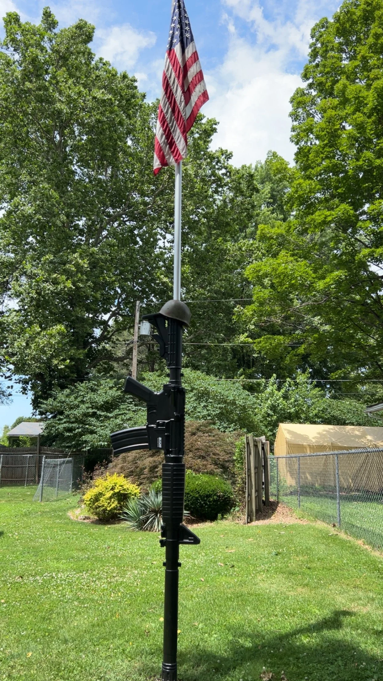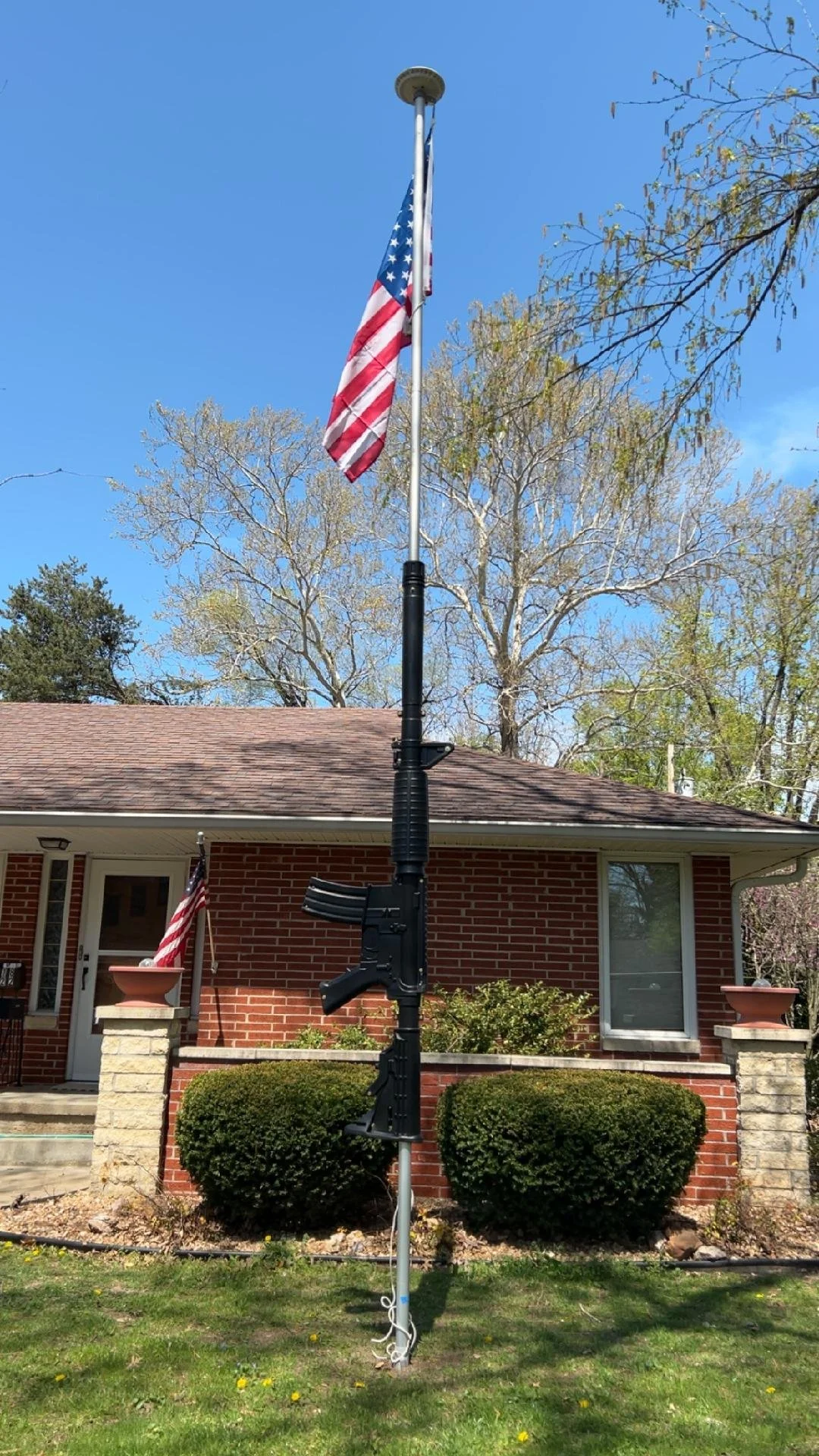 American Made Blu Line Sports Pole is indeed a unique product—a patented Sportspole featuring a decorative section styled like an AR-15 rifle which is 7’ 11” in length. Made with Polyethylene to endure the elements. The Aluminum pole is 20’ in length. With its 12-gauge wall strength it’s built to withstand 100+mph wind. This Sports Pole keeps its eye-catching look no matter the weather.